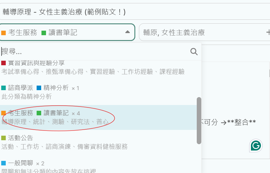3. 標籤分類 科目, 範圍(章節/概念) eg, 輔原, 阿德勒學派;普心, 全範圍;統計, 中央極限定理